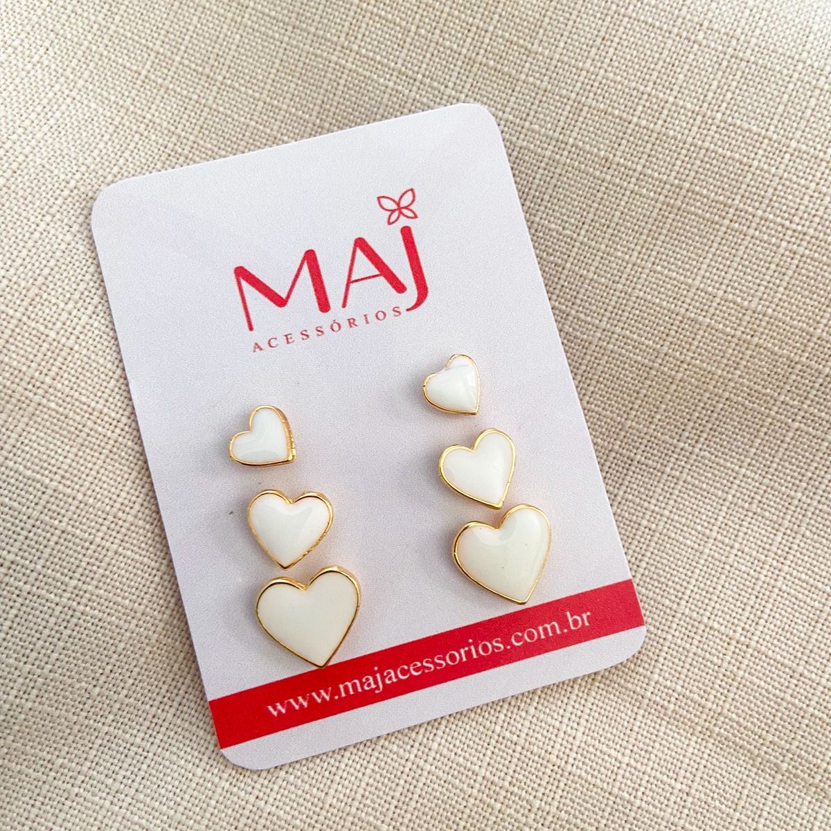 O Trio Coração Branco é uma escolha encantadora para adicionar um toque delicado e feminino ao seu visual. Composto por três brincos de tamanhos diferentes, cada um apresenta um design de coração branco, transmitindo uma sensação de pureza e elegância.